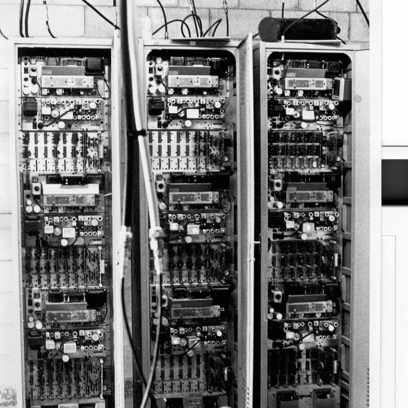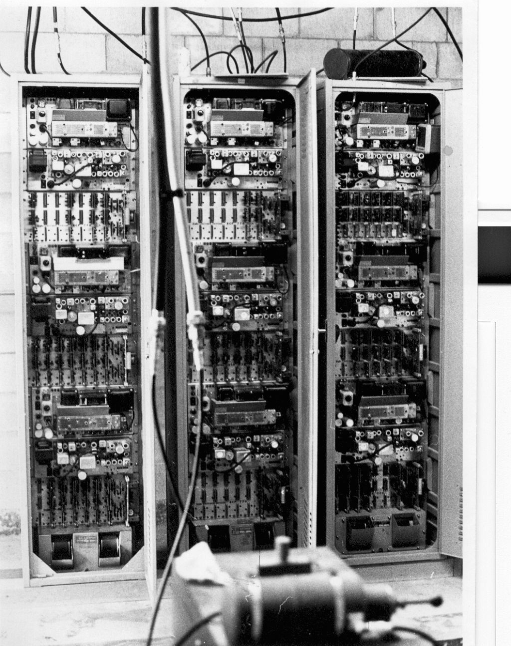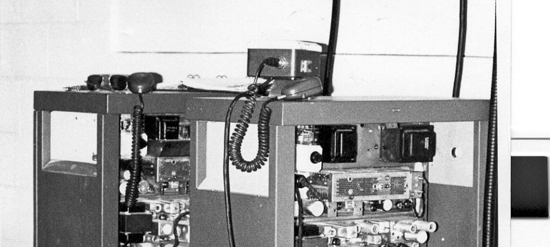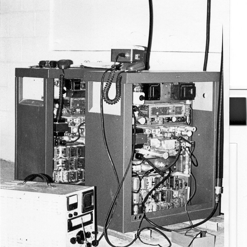 1971. Pacific Mobile Communications UHF repeaters on Santiago Peak above City of Orange CA. There are 9 GE Progress Line repeaters in the photo.